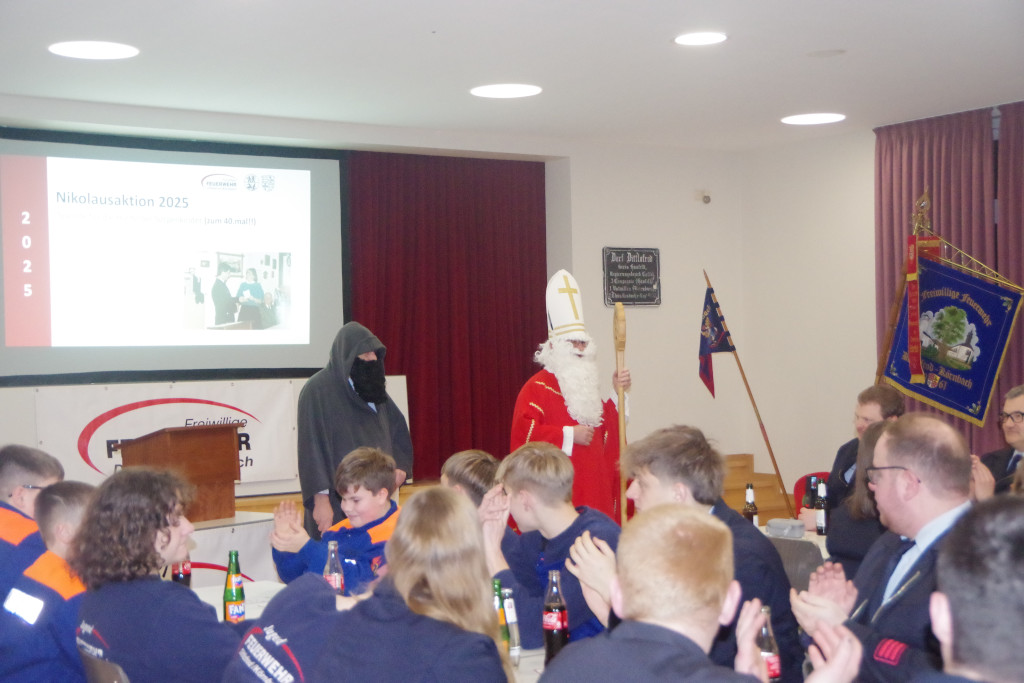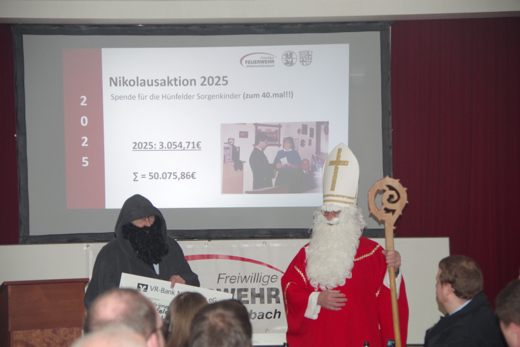 Die Jahreshauptversammlung der Freiwilligen Feuerwehr Dittlofrod/Körnbach begann in diesem Jahr mit einer ganz besonderen Aktion: Der „Dittlofröder Nikolaus“ Lothar Mihm, seit über 40 Jahren bekannt für seine Kindernikolausaktion, erschien im festlichen Nikolausgewand – begleitet von Knecht Rupprecht, dargestellt von Winfried Galler. Anlass war die traditionelle Spendenübergabe an die „Hünfelder Sorgenkinder“, die Mihm seit Jahrzehnten unterstützt.